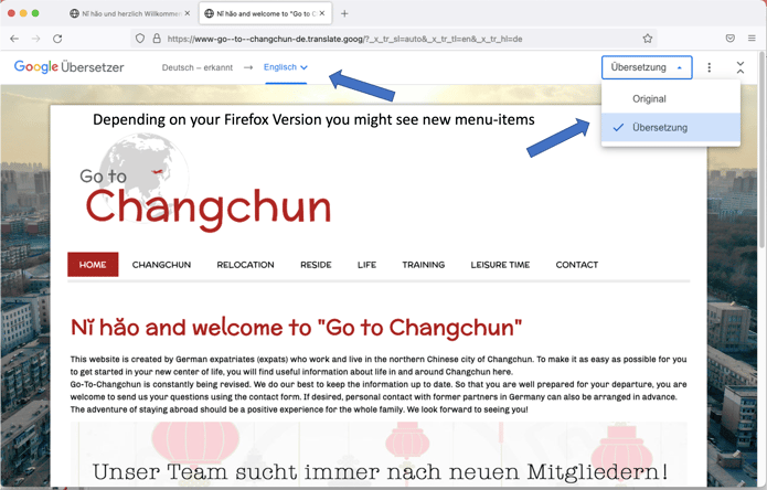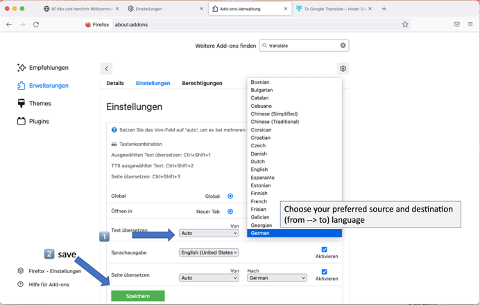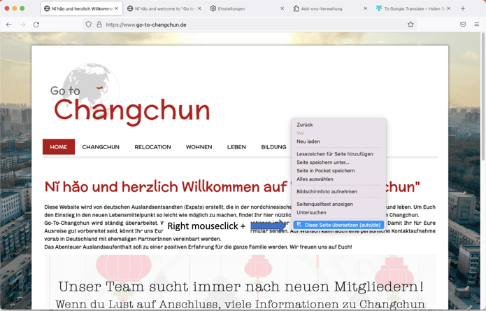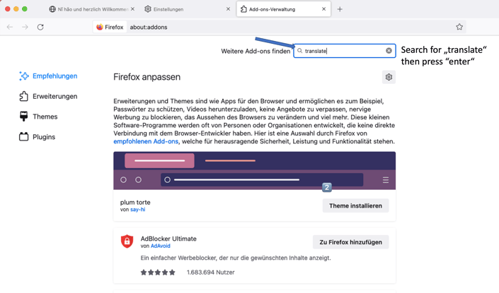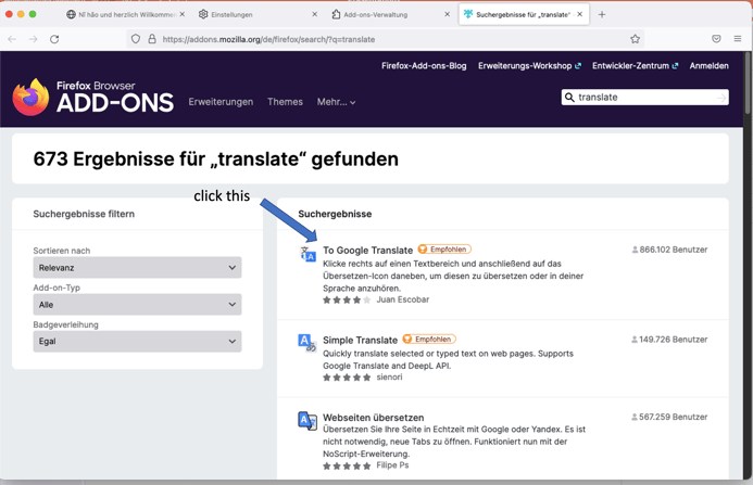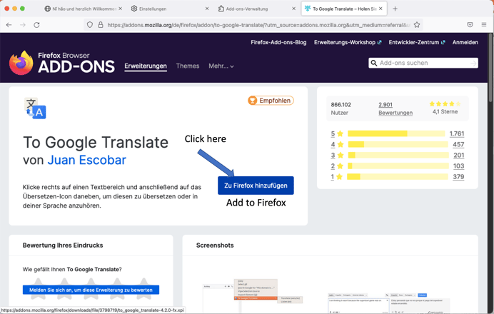 Mozilla Firefox offers no translation in standard configuration. The translation function must be installed as an extension.